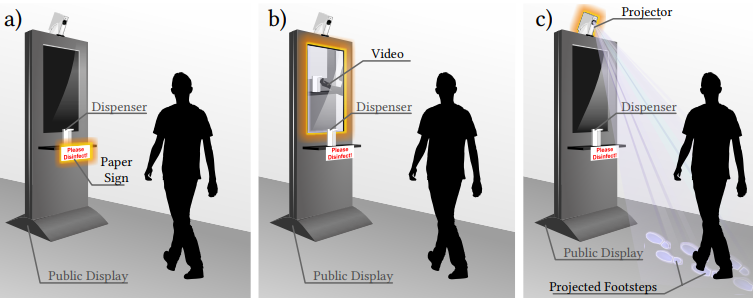 The global COVID-19 pandemic created a constant need for hand disinfection. While it is still essential, disinfection use is declining with the decrease in perceived personal risk (e.g., as a result of vaccination). Thus this work explores using different visual cues to act as reminders for hand disinfection. We investigated different public display designs using (1) paper-based only, adding (2) screen-based, or (3) projection-based visual cues...