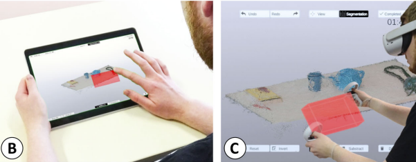 Scanning everyday objects with depth sensors is the state-of-the-art approach to generating point clouds for realistic 3D representations. However, the resulting point cloud data suffers from outliers and contains irrelevant data from neighboring objects. To obtain only the desired 3D representation, additional manual segmentation steps are required. In this paper, we compare three different technology classes as independent variables (desktop vs. tablet vs. virtual reality)...