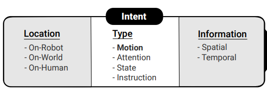 Robots are becoming increasingly omnipresent in our daily lives, supporting us and carrying out autonomous tasks. In Human-Robot Interaction, human actors benefit from understanding the robot’s motion intent to avoid task failures and foster collaboration. Finding effective ways to communicate this intent to users has recently received increased research interest. However, no common language has been established to systematize robot motion intent...